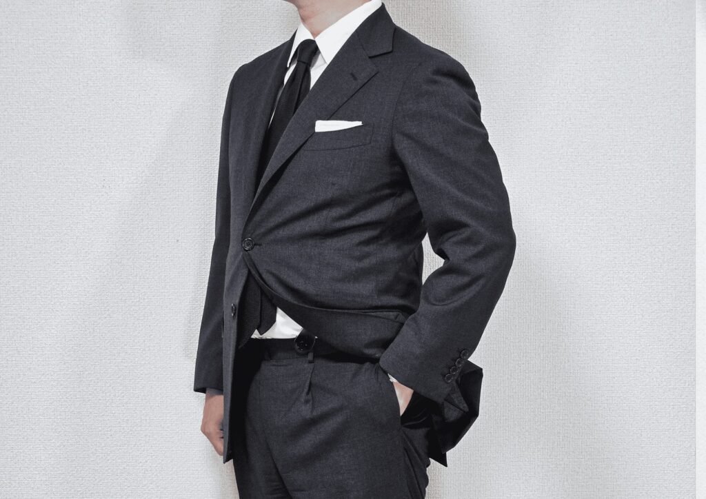 1着目:ロロピアーナ生地のチャコールグレースーツ(春夏)